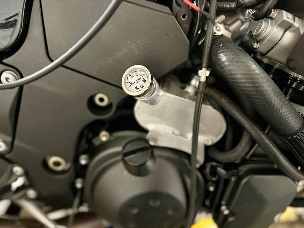 TTS’s aim was to make everything look as ‘factory’ as possible, which includes the inboard air filter and the custom intercooler, which is force-fed by the vents in the fairing. The only other giveaway that this is not an ordinary ZZR1400/ZX-14 is the supercharger oil reservoir, with oil level indicator, which exits a vent in the fairing.